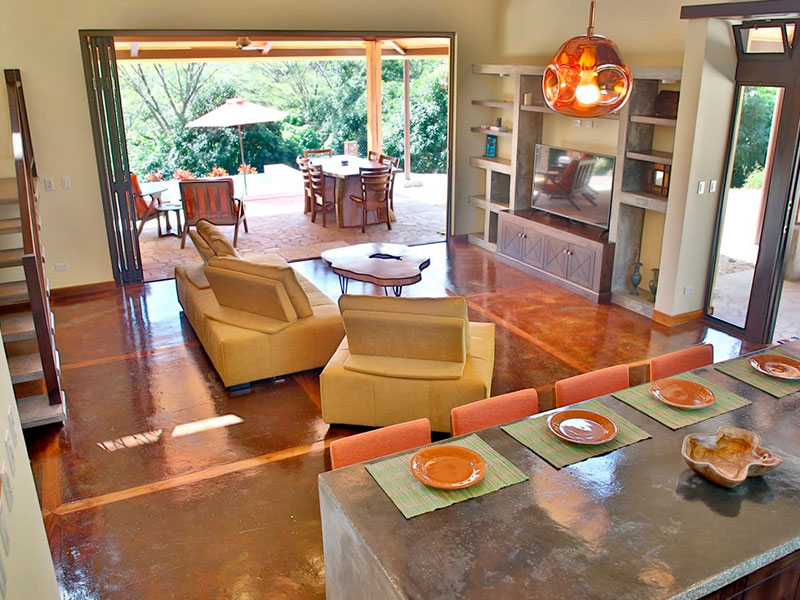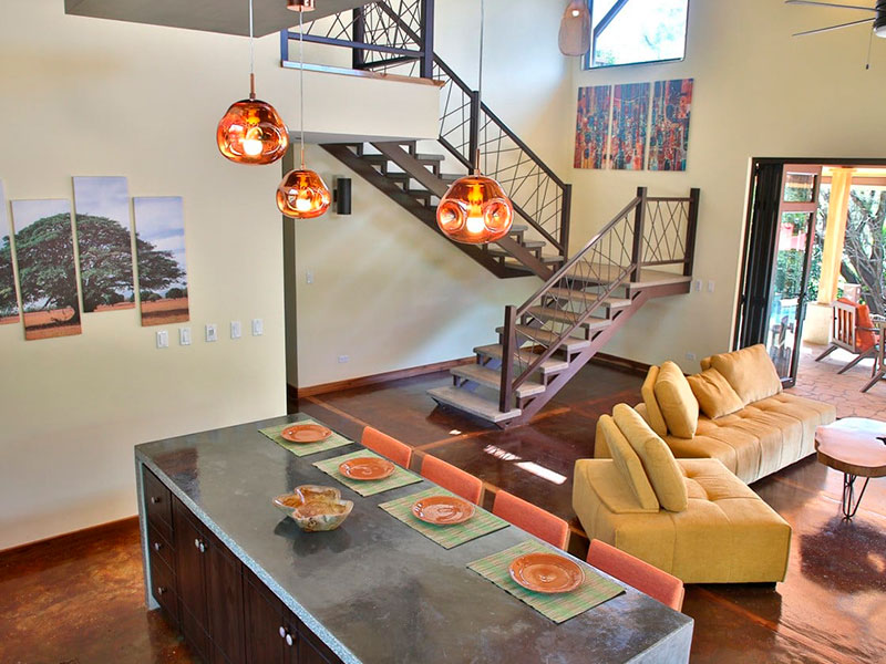 Una amplia área social contiene la cocina y la sala de estar, luego se proyecta al exterior para encontrar el comedor en una terraza cubierta y la piscina con borde infinito.
