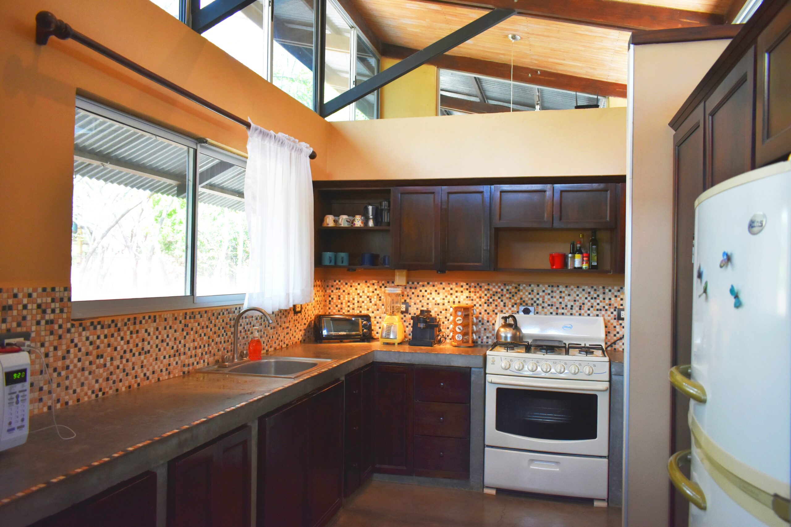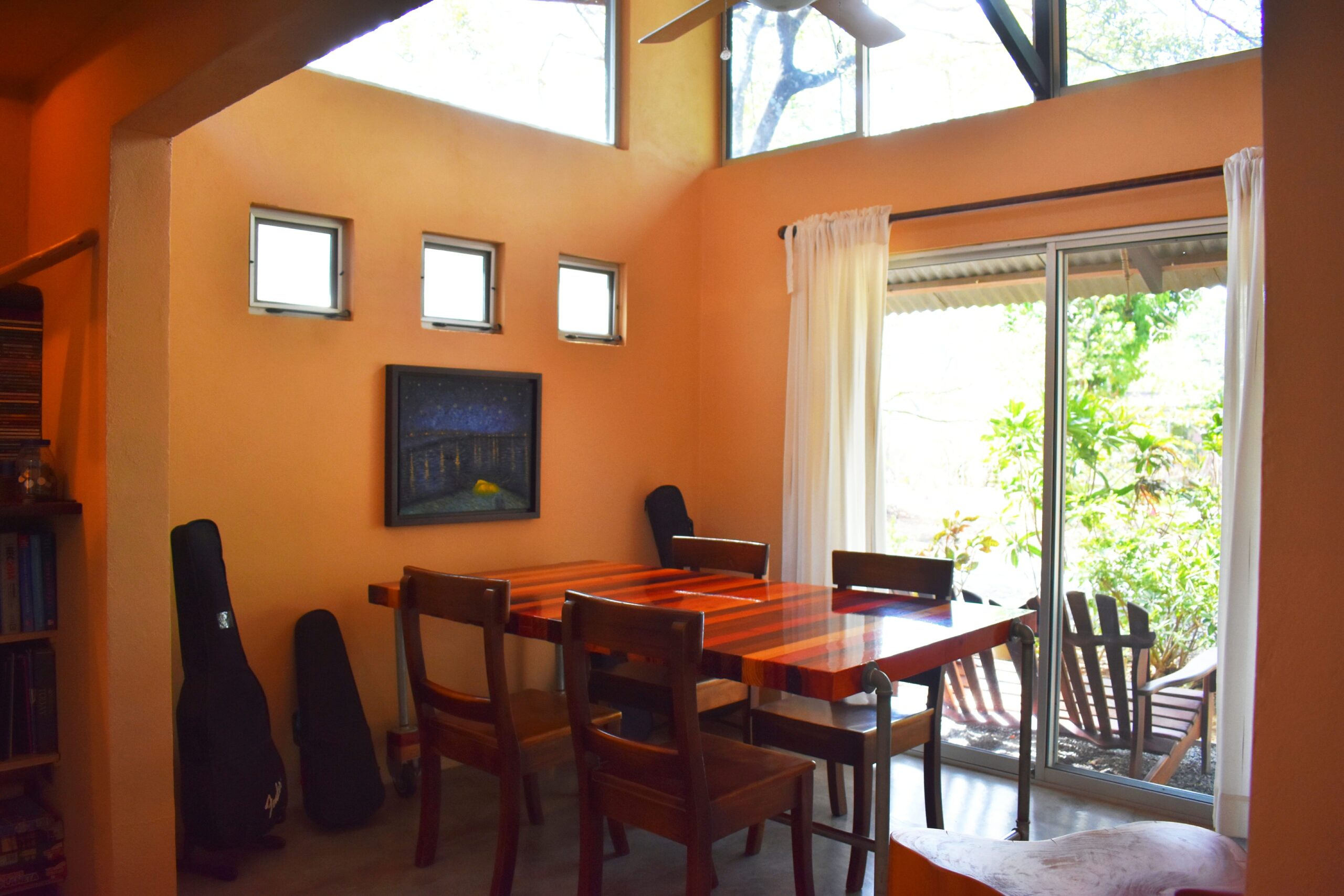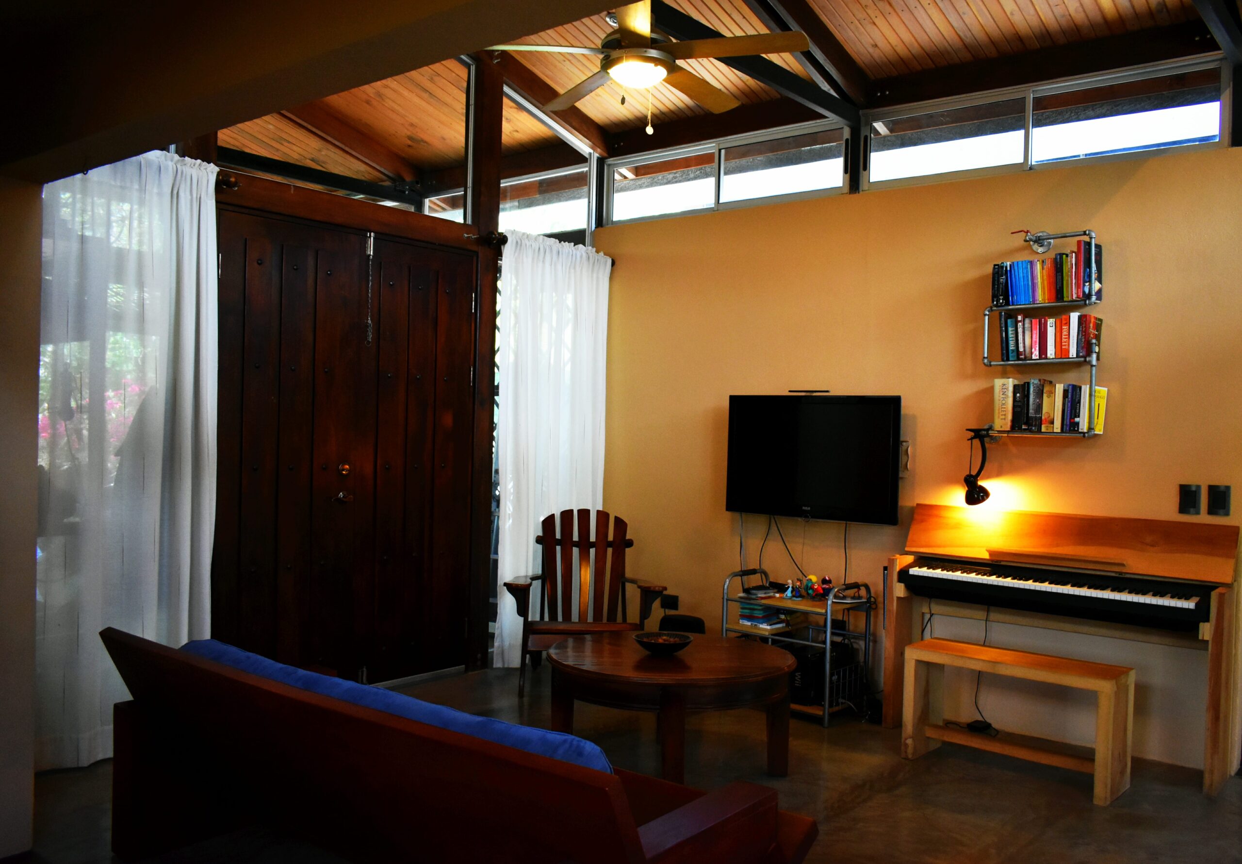 Los techos se han separado de las paredes para dar cabida a paños de vidrio corredizo que permiten la ventilación cruzada y la iluminación natural por toda la casa.